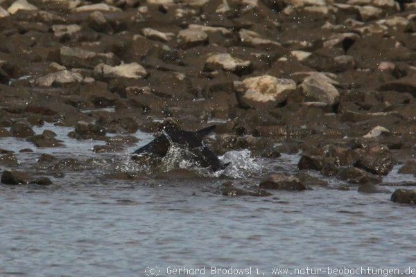 Die Bilder sagen wohl alles. Es ist ja nur ein ganz kleiner Moment und Ausschnitt auf den Bildern zu sehen. Was in Wirklichkeit dort los ist kann man nur vor Ort erleben. Ob das sehenswert ist, ich hoffe nicht. Es stehen die Krähen, die Silbermöwen und die Mantelmöwen um den Fisch herum und warten darauf, dass einer den Anfang macht den Fisch bei lebendigem Leibe zu fressen. Die Möwen müssen ihre guten Plätze beim Fisch gegenüber ihren Artgenossen immer wieder verteidigen. Es kommt dann immer zum Stress unter den ganzen Vögeln. Wenn man früh morgens bei Ebbe über den Deich schaut, sieht man hin und wieder auch einen Fuchs mit einem Fisch verschwinden. Sieht so Naturschutz aus? Auch Fische haben ein Recht auf ein humanes Leben.