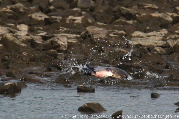 Dass Fische auf Grund laufen findet auch im Hamburger Hafen statt. Durch die Hafenvertiefung laufen einige Kanäle bei Ebbe leer und dort geht es den Fischen nicht besser. Und bei der Elbvertiefung sieht es an einigen Flüssen nicht anders aus. Ich zeige Euch noch ein paar Bilder auf denen Ihre sehen könnt, wie Fische bei lebendigem Leib gefressen werden. Ob das mit dem Naturschutz zu vertreten ist, ich weiß nicht. Es kann doch nicht sein dass viel Geld für den Naturschutz ausgegeben wird und im Endeffekt wird den Tieren dadurch nur geschadet. Es kann ja jeder selber sehen wie die Fische leiden müssen.