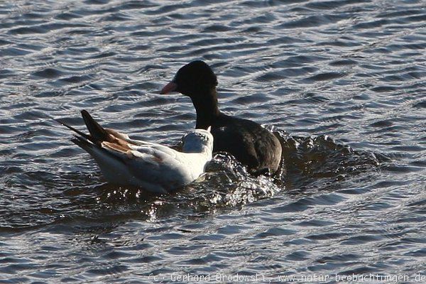 Im allgemeinen haben Lachmöwen im Winter kein Problem an Nahrung heranzukommen. Aber der Winter 2010 hat es in sich gehabt. Durch den anhaltenden Frost waren viele Flüsse und der Hamburger Hafen zugefroren und die Lachmöwen konnten nicht bei Ebbe im Elbschlick nach Kleintieren suchen. Es gab noch einige offene Wasserflächen in Hamburg, wie z.B. an der Lombardsbrücke. Hier taucht die Blässralle, auch Blässhuhn genannt, nach Schnecken und Muscheln. Und auf die Muscheln und Schnecken haben es auch die Lachmöwen abgesehen. Die Lachmöwe bedrängt das Blässhuhn, wenn es auftaucht solange, bis es die Schnecke oder die Muschel wieder fallen lässt. Dabei geht es nicht zimperlich zu, wie Ihr auf den nächsten Fotos sehen könnt. Vögel beobachten bringt immer wieder Spaß.