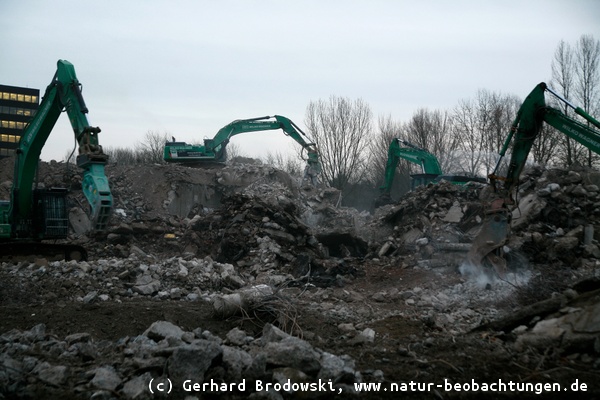 Der Abriss vom BP Gebäude in der City Nord in Hamburg geht zügig voran. Es ist schon gewaltig, mit was für einer Leichtigkeit die Schere sich vorne am Bagger durch den Beton frisst. Es wird bis in die Dunkelheit gearbeitet. Die Uhus schauen am späten Abend zu wie ihr alter Brutplatz, der letzten Jahre, langsam aber sicher verschwindet. Sie haben schon einen neuen Platz in Augenschein genommen. Ob es dort was wird, werden wir sehen. Möglichkeiten haben sie genug.