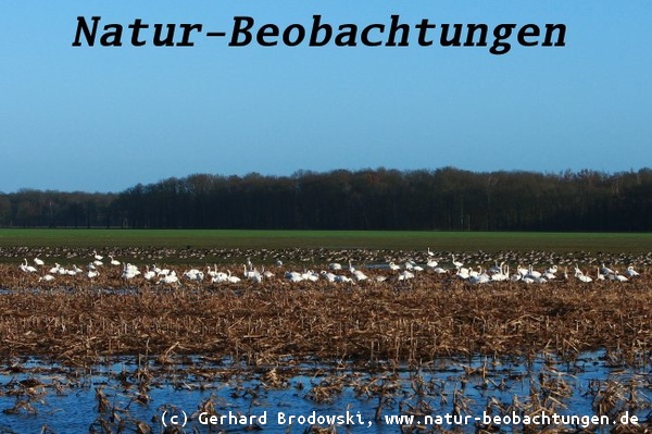Bei den Singschwänen im Winterquartier, bei uns in Deutschland, muss man auch immer ganz genau hinschauen. Häufig sieht man auch einige Zwergschwäne zwischen den Singschwänen. Die Zwergschwäne fallen kaum zwischen den Singschwänen auf. Man erkennt sie am Schnabel und an ihrer Größe. Allgemein überwintern die Singschwäne und die Zwergschwäne in großen Trupps unter sich. Hin und wieder sieht man auch Höckerschwäne zwischen den Singschwänen oder zwischen den Zwergschwänen.