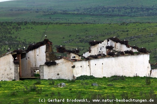 Wir setzen unsere ornithologische Tour durch die Extremadura fort. Zuerst steuern wir Trujillo an. An der dortigen Stierkampfarena kann man sehr gut eine Rötelfalkenkolonie beobachten. Außerdem sieht man an Hochspannungsmasten, Kirchen und Ruinen überall Weißstörche brüten. Auch der Wiedehopf, der Einfarbstar, das Schwarzkehlchen und der Steinkauz sind hier in der Region gut zu beobachten.