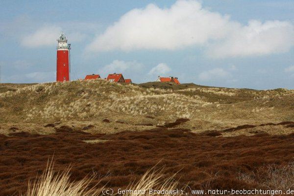 Den Leuchtturm im Naturschutzgebiet Eierlandsche Duinen sieht man schon von weitem. Dort befindet sich ein großer Parkplatz, von dem aus man Wanderungen unternehmen kann.